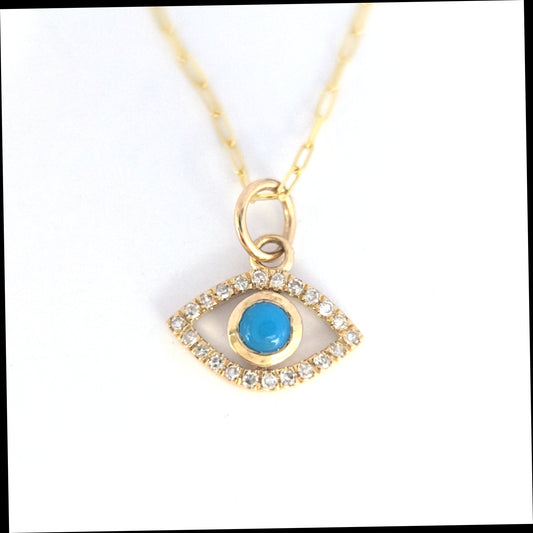 14kt Solid Gold Evil Eye Pendant Necklace with Diamonds and Turquoise