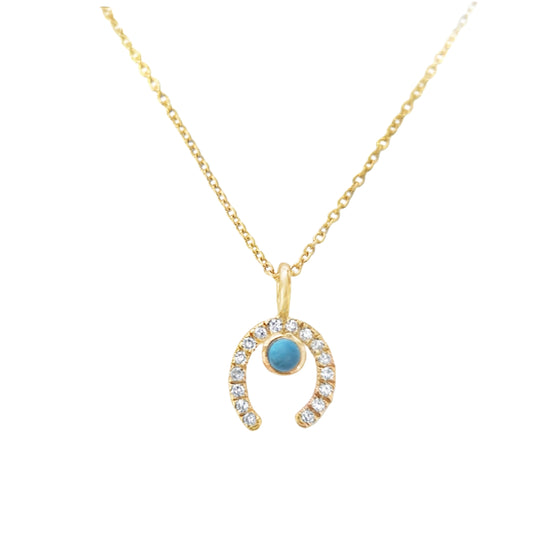 Yellow Solid 14kt Gold Horse Shoe Diamond Charm Necklace with Round Turquoise Cabochon